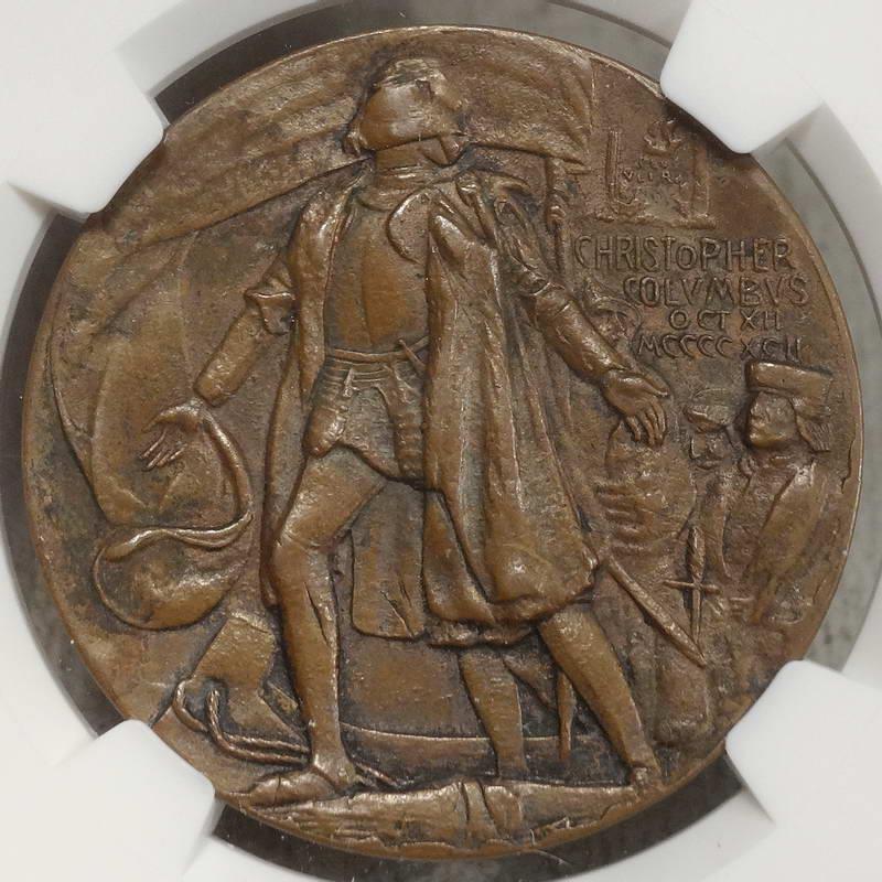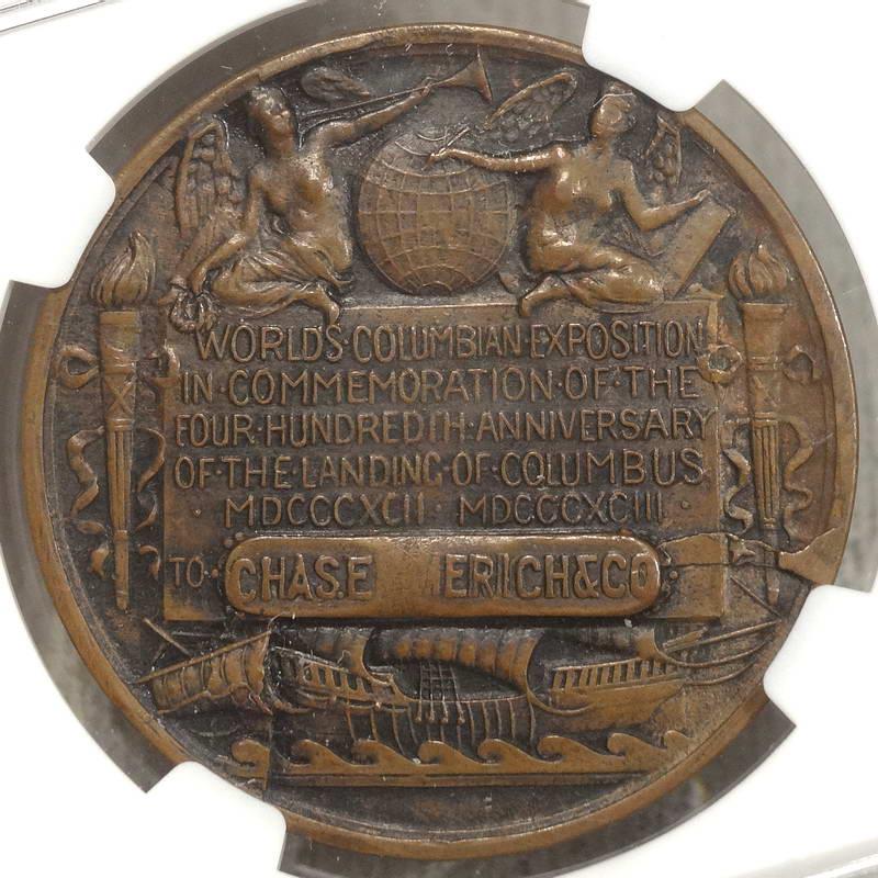 HK-223, St. Gaudens Dollar, a souvenir of the 1893 World's Columbian Exposition at Chicago. This is SH 6-7.1 CU, the far scarcer 'Chas. Emmerich' version. Total NGC Pop of 6 versus almost 75 of the commonly seen 'C. Emmerich' variety. This is the lowest certified example at NGC AU-55, which I think is undergraded - this piece is effectively Unc other than maybe some extremely light 'cabinet friction'. This is neither here nor there as I submitted it due to features on the piece which may explain why so few examples seem to exist. Both dies used were near terminal, with a major interior die break on the Obverse that covers Columbus' face. The Reverse die is broken at 7:00, with significant displacement (sinkage) and a large retained cud connecting the name plate with the rim. There are also some various smaller die cracks in various places. Something I have not seen before on the 'Emmerich' pieces is clear recutting on the 'RI' of the name, likely unique to this die. All these defects as well as the metal flow issues with the use of 'Chas. Emmerich' on the Reverse almost certainly led to retirement of both dies, and production of a new Reverse to try to eliminate striking problems. More than one Obverse die would almost certainly been already existed, to strike the various other versions of this HK. I have traced about a half dozen distinct examples of this variety, including 2 of the 5 other NGC certified pieces, and all but one show various stages of cuds/cracks. The present example shows the most extensive die damage, indicating that it was close to the end of production with this Reverse die. More important and interesting as a research project than 'just' a SH 6-7.1. Value is relative and is based upon my cost and what I think this piece might be worth. More images available upon request.