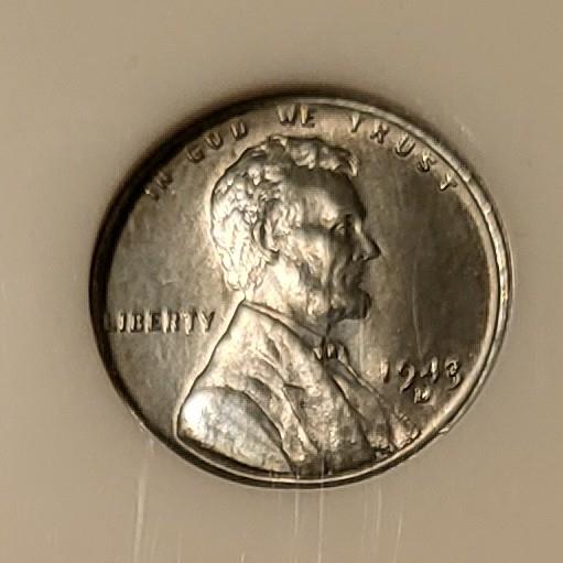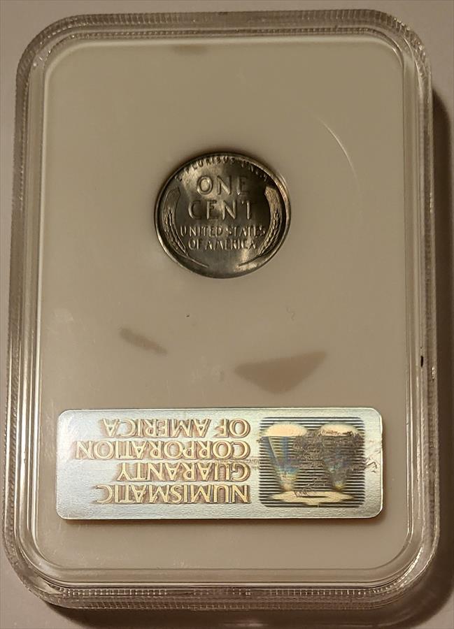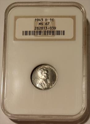 1943 D Lincoln Wheat Cent. WWII, Steel. Graded Mint State 67 by NGC. Light Patina. Early Generation 'Old Fatty' Holder (OH).