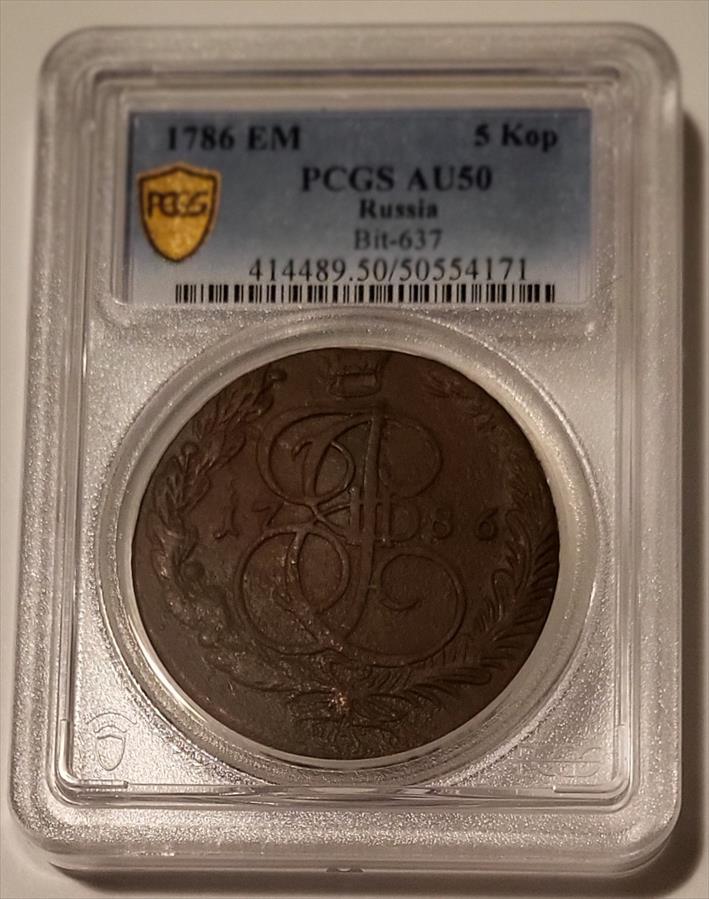 Russia Catherine II 'The Great' 1786 EM 5 Kopeks. Bit-637, Copper. Graded About Uncirculated 50 (BN) by PCGS - Gold Shield/Thick Holder.