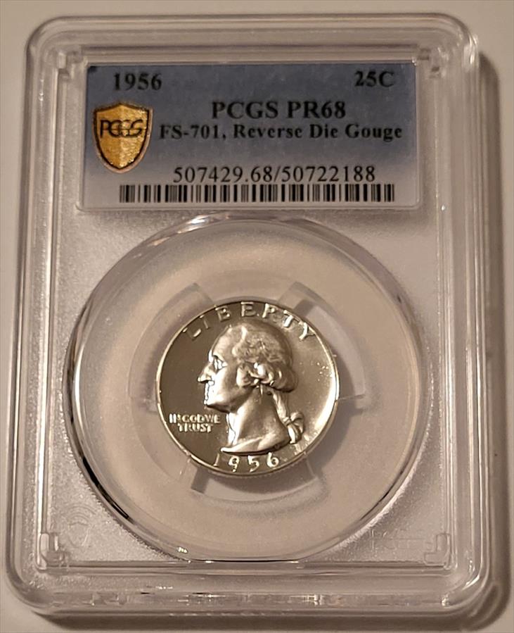 1956 Washington Quarter. Philadelphia Mint. Silver. Reverse Die Gouge Variety, FS-701. Graded Proof-68 by PCGS - Gold Shield Holder.