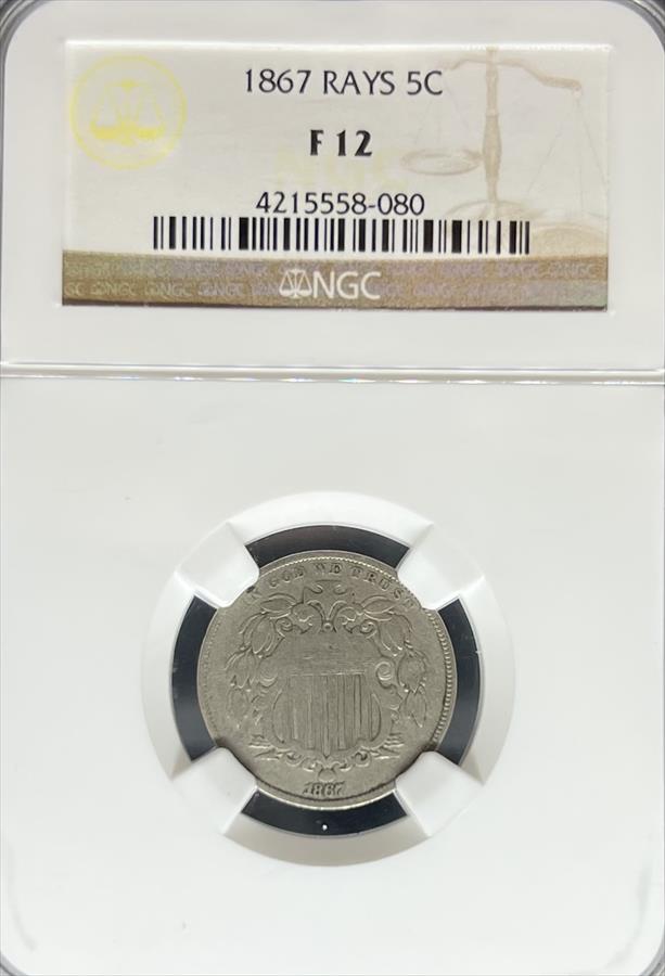 1867 Shield Nickel F12 NGC Rays