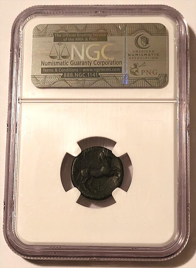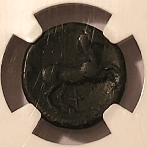 Ancient Greek: Thessaly, Skotussa c. 300-190 BC AE Trichalkon. Copper. Obverse: Athena; Reverse: horse prancing. Graded Very Fine by NGC. Strike: 4/5; Surface: 3/5.