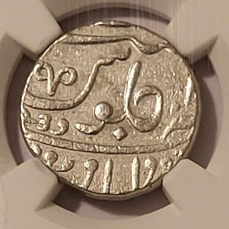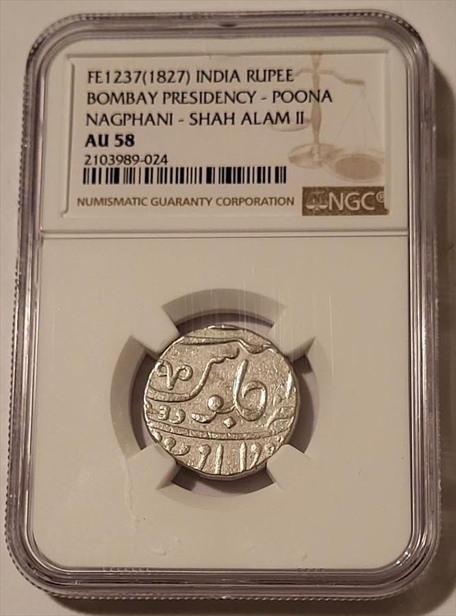 India, Bombay Presidency Poona Nagphani - Shah Alam II FE1237 (AD 1827) Silver Rupee. Graded About Uncirculated 58 by NGC.