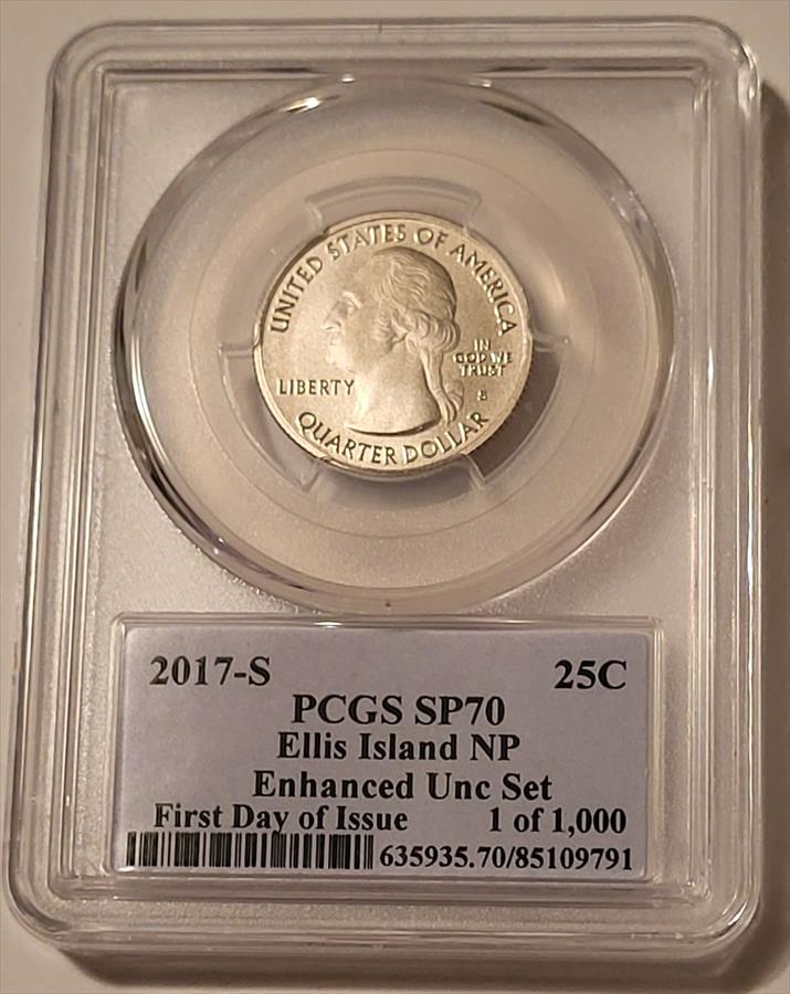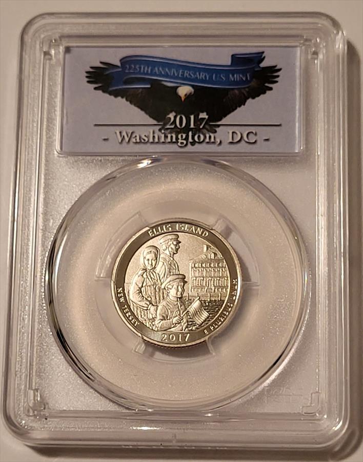 2017 S Ellis Island National Park Quarter - Enhanced. Copper-Nickel/Clad. Graded Specimen-70 by PCGS. First Day of Issue. U.S. Mint 225th Anniversary Label - Washington D.C. Releases 1 of 1,000.