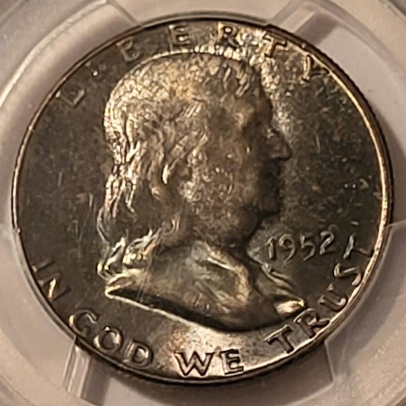 1952 Franklin Half Dollar. Philadelphia Mint. Silver. Graded Mint State 65 by PCGS - Gold Shield Holder. Toned.