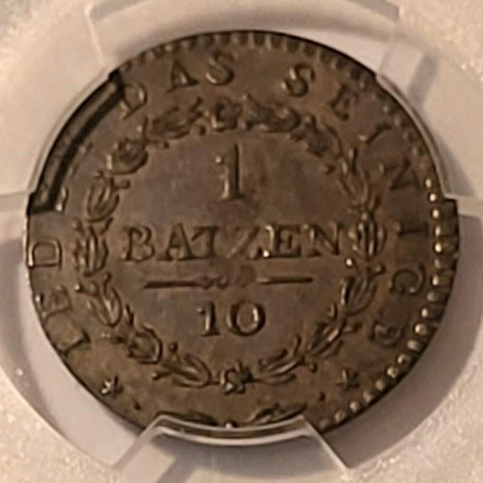 Switzerland - Cantons, Appenzell 1808 1 Batzen. Billon. Graded About Uncirculated 58 by PCGS - Gold Shield Holder. Toned.