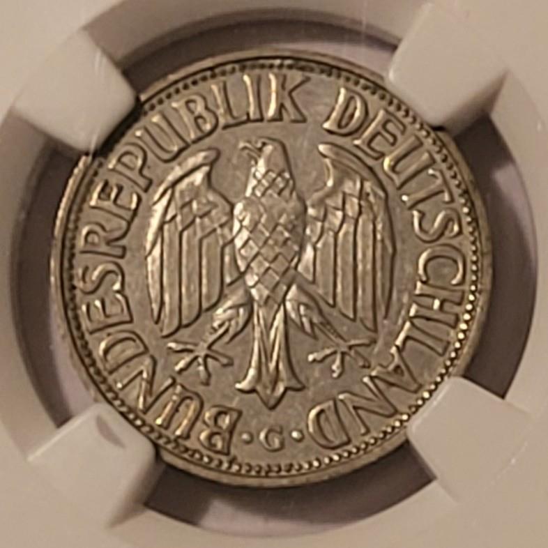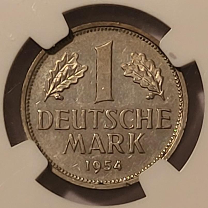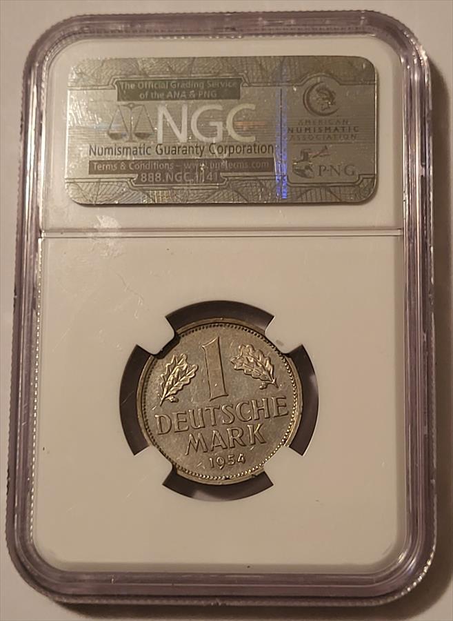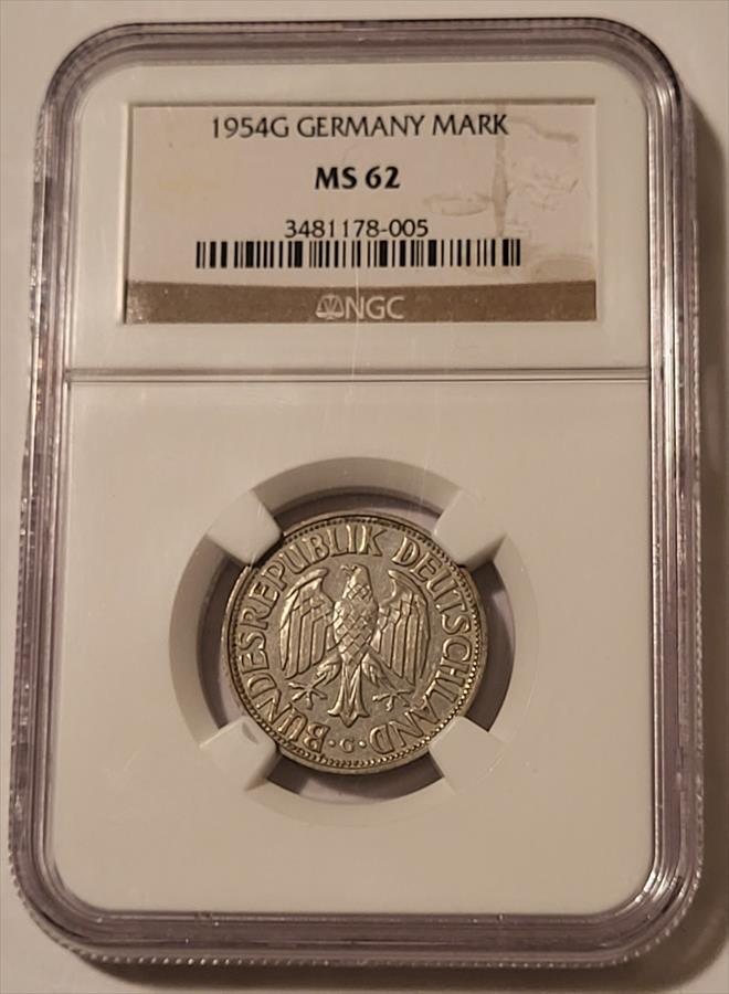 West Germany 1954 G Mark. Copper-Nickel. Graded Mint State 62 by NGC. Light Patina. Scarce in mint state - high guide value.