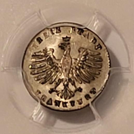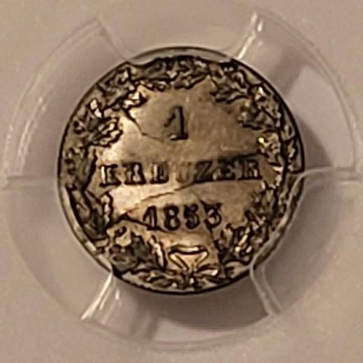 German States Era - Frankfurt Am Main 1853 Kreuzer. Silver. Graded Mint State 63 by PCGS - Gold Shield Holder. Toning.