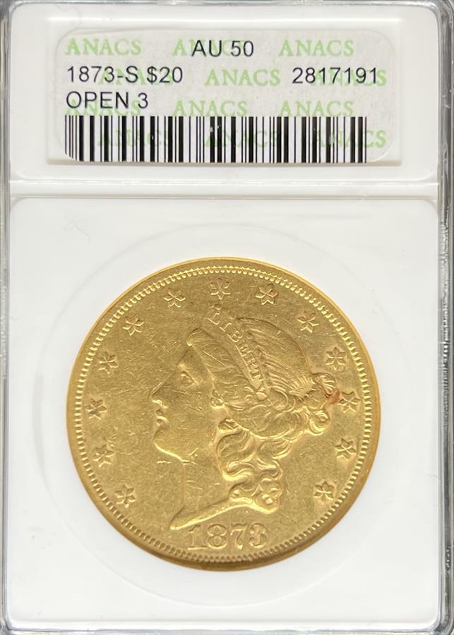 1873-S Open 3 $20 Liberty AU50 ANACS