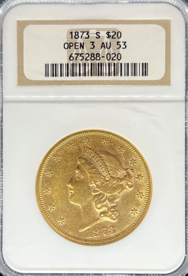 1873-S Open 3 $20 Liberty AU53 NGC