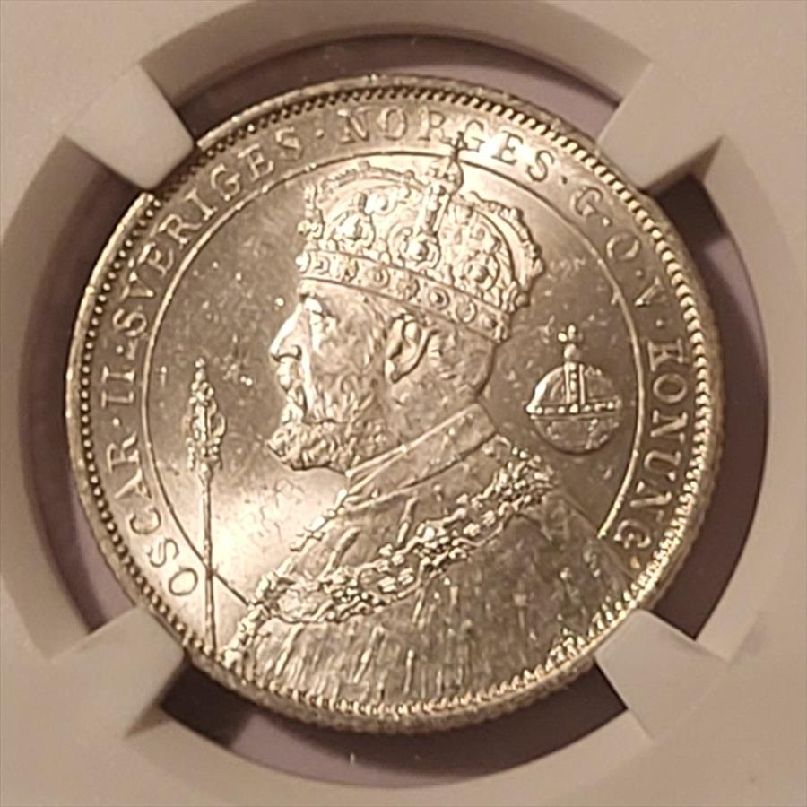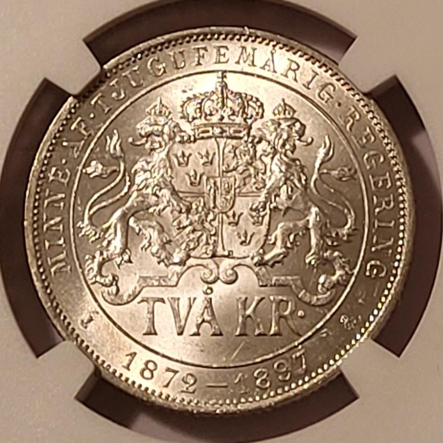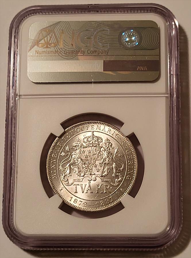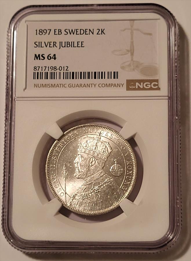 Sweden Oscar II Silver Jubilee 1897 EB 2 Kronor MS64 NGC