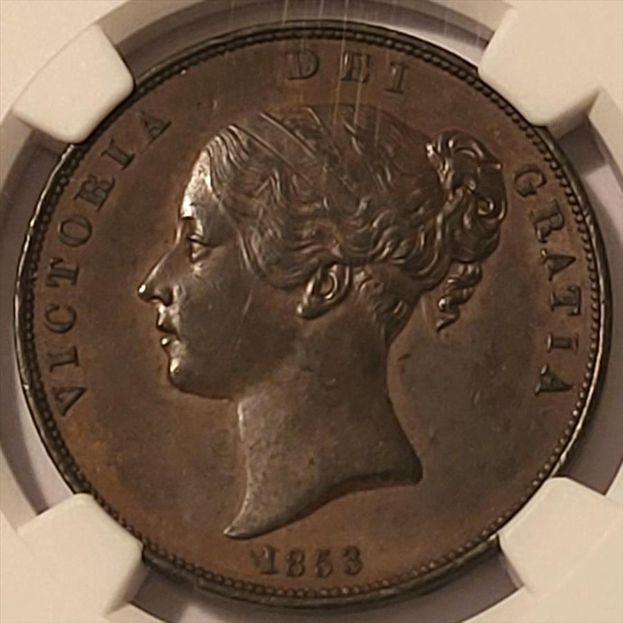 Great Britain Victoria 1853 Penny. Ornamental Trident. Copper. Graded About Uncirculated 55 BN by NGC.