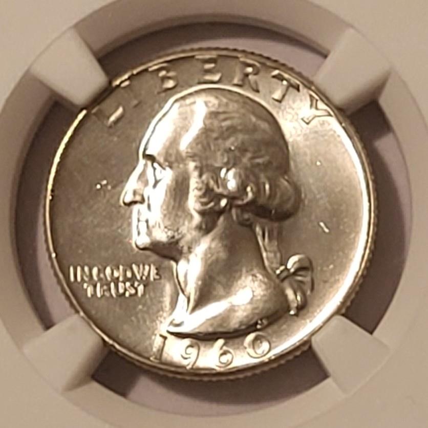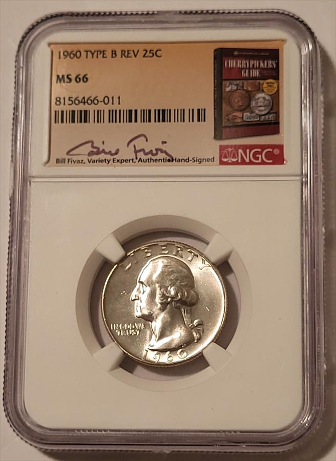 1960 Washington Quarter. Philadelphia Mint. Silver. Type B Reverse Variety, FS-901. Graded Mint State 66 by NGC. Bill Fivaz Hand-Signed Label.