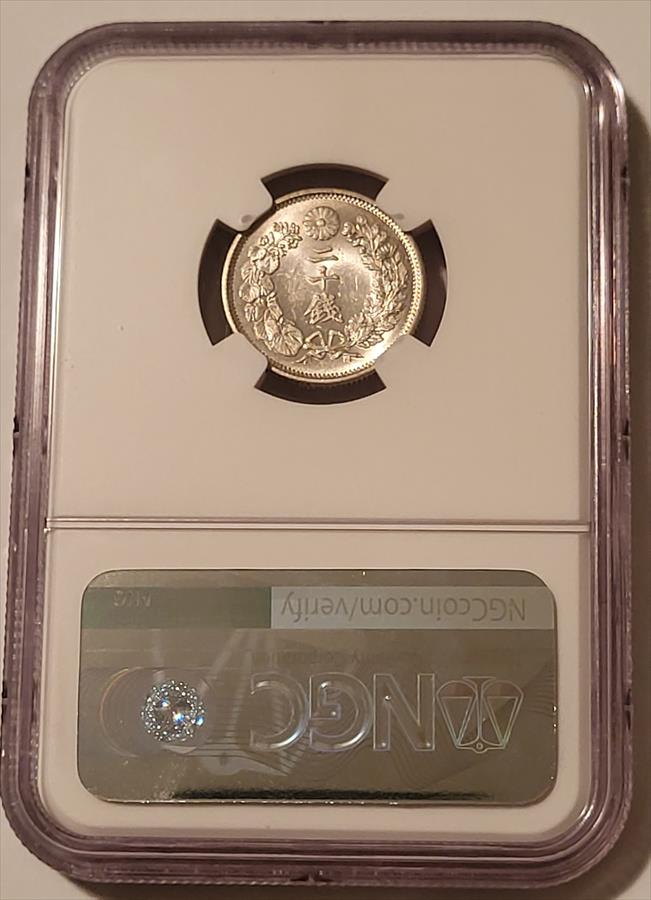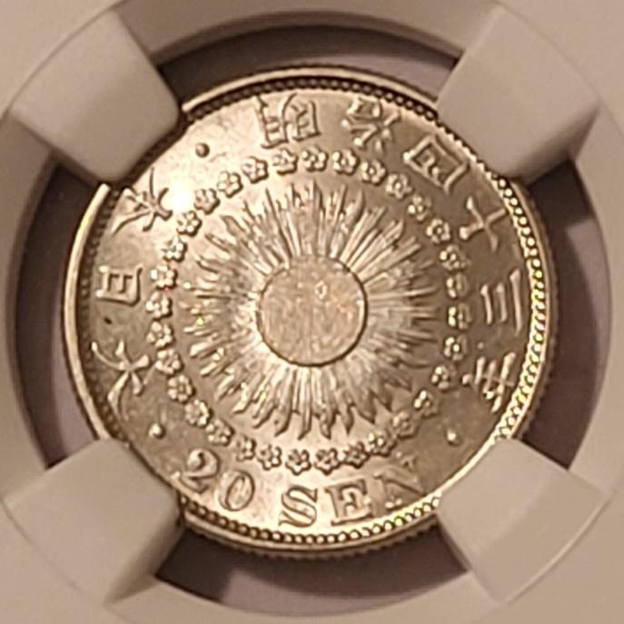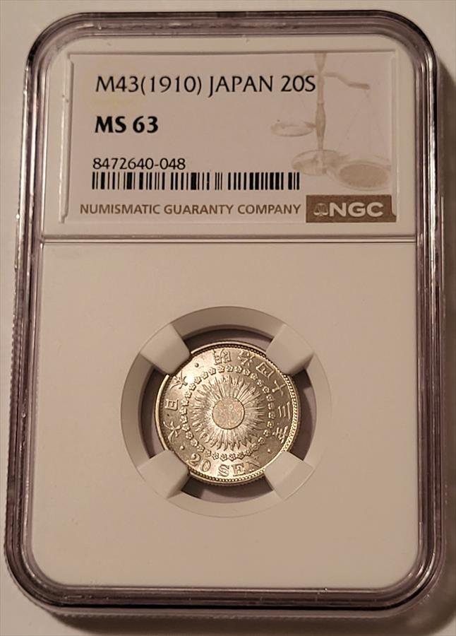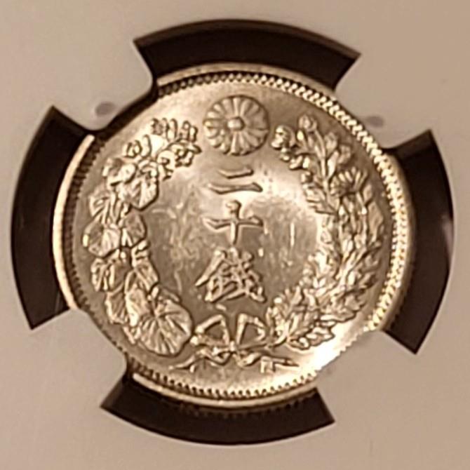 Japan Meiji Era 1910 Silver 20 Sen MS63 NGC